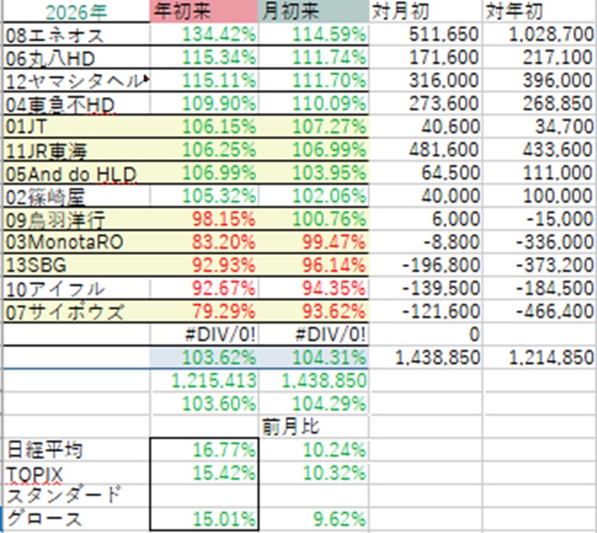 ・1月・・・引き続きグロースに逆風でサイボウズ、MonotaRO急落、去年4月暴落時の水準に。ソフトバンクGも乱高下でマイナス。エネオスが地政学要因で急伸。上昇相場だが総資産はマイナスに。