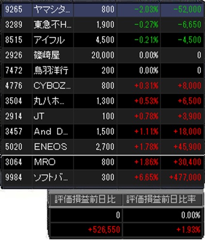 ※画像の評価損益前日比率はキャッシュを含まない株式のみのもの。
