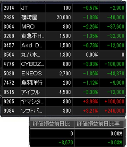 12銘柄保有中2銘柄だけの上昇で全体ではほぼ±0の微々たる下落に。ソフトバンクGは買値から4倍がすぐそこになっています。準主力のヤマシタヘルスケアHDは普段から相場と全く連動しないんですが、今日は監視銘柄中1位の上昇率で保有資産全体を相場の下げから引き上げました。