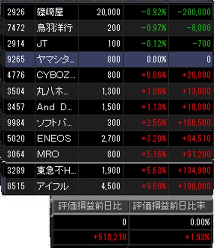 他、12銘柄保有中8銘柄が上昇に。第3四半期好決算発表からまもないMonotaROは大幅高。この銘柄はやはり最近株価は下げ過ぎていた?そのさなかに2回買い増ししていますが、一気に上げてきました。第2四半期最高益、増配発表の東急不HDも大幅高で年初来高値。決算自体の正式な発表はまだだが、上期業績の大幅上方修正を発表したアイフルも急伸で年初来高値。しかし、そのアイフルの上昇分と篠崎屋の下落分が同じくらいですね。決算を明後日に控えるエネオスも今日大幅高で年初来高値。何と保有4銘柄が年初来高値となっています。決算を反映していると言えますが、篠崎屋のように急落している銘柄も。その急落を吸収し資産全体では今日は日経平均を上回る上昇に。今日は色々上昇が重なりました。
