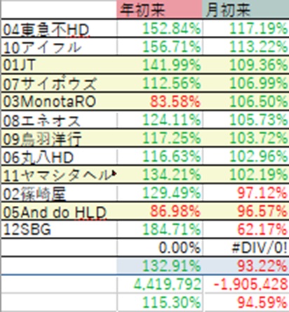 ※年初来の株価が+32.91%に対し、総資産増加率が+15.3%にとどまる主な要因は、4月の知多鋼業全売却の際の譲渡益税で約-8%相当、そこで一時的に現金が資産全体の60%超の状態になり、株価が上がっても資産はあまり上がらない状態になり、徐々に買い増していったが買った時点で株価は年初来ではかなり上がっていたため、年初来上昇率よりはパフォーマンスは劣り、現在も現金比率20%で、その分上昇率で劣る、など。