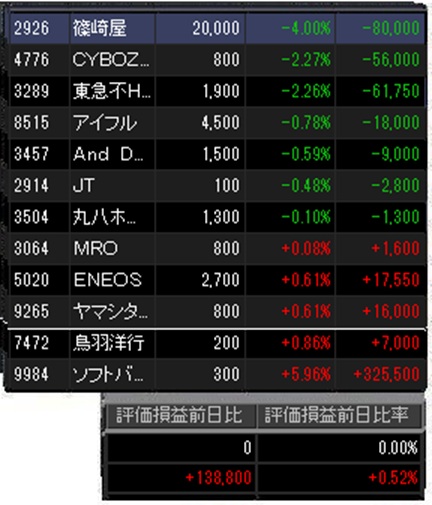 ※画像の評価損益前日比率はキャッシュを含まない株式のみのもの。