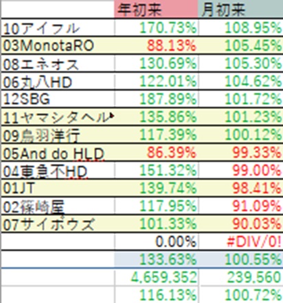 ※画像の株価全体の年初来上昇率33.63%に対して総資産上昇率が16.13%にとどまるのは、4月にそれまでの主力であった知多鋼業を全売却した際の譲渡益税が-8%相当ほどだったことに加え、売却に伴い株以外のキャッシュが一時60%を超えており、その後だんだんと買い増しで20%まで減ったもののその分は上昇はせず、株価自体も年初来では大幅+でも買い増し時は年初より上がっており高く買っているなどの理由で抑えられている。