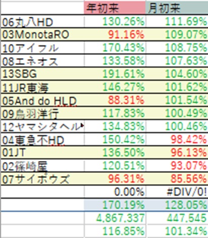 ※年初来の株価が+70.19%に対し、総資産増加率が+16.85%にとどまる主な要因は、4月の知多鋼業全売却の際の譲渡益税で約-8%相当、そこで一時的に現金が資産全体の60%超の状態になり、株価が上がっても資産はあまり上がらない状態になり、そこから徐々に保有銘柄を買い増していったが買い増した銘柄の株価はその時点で年初来ではかなり上がっていた(JR東海などは年初来+46.27%だが買ったのは昨日今日のため、+どころか含み損)ため、その分上昇率で劣る、など。