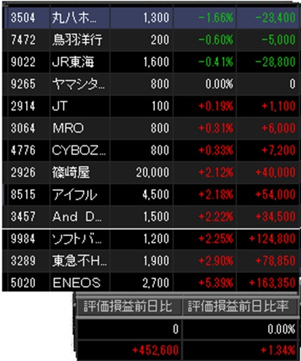 ※画像の評価損益前日比率はキャッシュを含まない株式のみのもの。(去年末からキャッシュは限りなくゼロに近くなりましたので、キャッシュを含めてもほぼ同じに。)