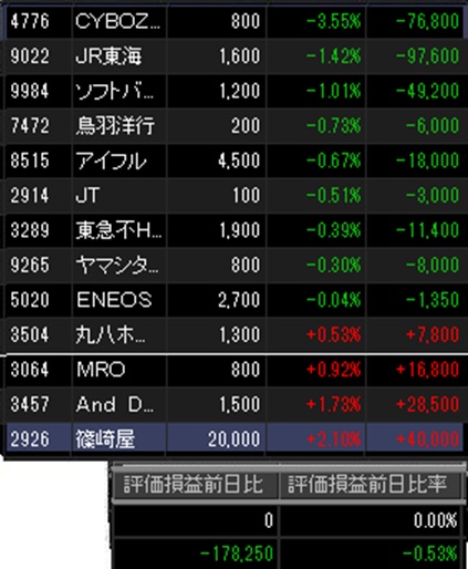 今のところ主力の東海旅客鉄道の下落は別にいい。ソフトバンクGの大幅安もしかたないでしょう。個人的には去年からとことん下げ続けているグロース2銘柄が頭が痛い。これだけの業績でここまでずうっと叩き落され続けると…ただ、業績に比して株価がこれだけ伸びない状況が何年も続くとさすがにどこかで水準訂正がありそうにも思いますが…とりあえず辛抱ですね。株価ではなく会社に投資するんです。笑