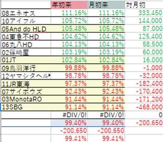 保有銘柄は全面安というわけではなく、上がっているものもある。エネオスなどはベネズエラ、イラン情勢と石油関連の材料が多く、他の石油元売り各社と同様に年初来高値を更新。唯一指数よりも株価が上がっています。アイフルも日銀利上げで金利のある世界ということで銀行や保険と同様の金融株という位置づけで上昇のエンジンに?And do HLDは業績が落ち込んでいて回復途上ながら、やけに株価だけ最近強い。東急不HDも他のデベロッパー同様セクターごと上がっています。これも高市トレードですかね。積極財政→不動産も追い風と。丸八HDはグロースと真逆で、超割安資産バリュー株は最近割安な銘柄が減ってきた日本株の中にあって見直されたか、上がっているものが多い。このように、保有銘柄の中では業績、株価好調なものが複数ある。しかし、それ以上にポートフォリオ上位の主力が軒並み株価が悪い!