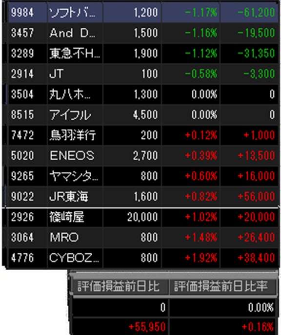 保有銘柄では昨日、子会社アームの株高に、主たる投資先のオープンAIが新たに巨額の資金調達協議、の報などで株価が急伸したソフトバンクGは今日は反落。And do HLDと東急不HDの不動産2銘柄も下落。