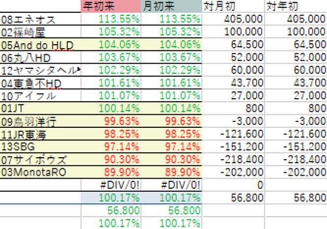年初からすごい上昇相場の今年、ちょっとここに来て株価は調整が入ったものの、依然かなりの上昇に。ところが保有銘柄は13銘柄中で市場平均株価指数の上昇率を上回っているのはエネオス1銘柄のみ。主力、東海旅客鉄道は-1.75%。準主力、ソフトバンクGは-2.86%。そしてそれに次ぐサイボウズは何とマイナス9.7%…MonotaROは-10.1%と、いい所がありません。逆に言うとそれでもやっとのことで年初来+まで来たというのは、やはり相場好調の証左でしょうか。