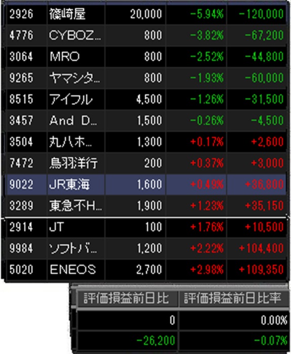 MonotaROも乱高下とは言わないが上下激しいですな。ここ連日高値のヤマシタヘルスケアHDもさすがに反落。ここからどんどん下げるかもしれないですし。アイフルも↓ですか。昨日急落のソフトバンクGは少し戻しました。JTも年初来高値。今日決算発表の東急不HDも↑でした。東海旅客鉄道も少し↑。