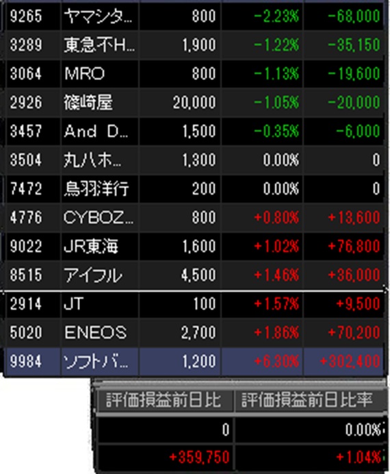 前日米SOX指数は大幅高だし、選挙の自民大勝を見越して日経平均先物も跳ねているし、さすがに今日は保有銘柄にも恩恵はあるだろうと思っていましたが、準主力で日経平均指数への寄与度、連動性が高いソフトバンクGはそこそこ株価が跳ねたものの、主力の東海旅客鉄道は言うほど上がらず、エネオスは年初来高値は更新しましたが相場よりは弱く、JTが年初来高値と言っても100株のみの保有で資産全体への影響は微小で、ヤマシタヘルスケアHDに至っては2.23%安と大幅下落。好決算だった東急不HDも下落。まあやはり織り込んでいましたか。しかし、無保有の三菱地所と三井不動産は相場にのって力強く上昇していますね。まあいいや。MonotaROも下落ですって。好決算、篠崎屋も。
