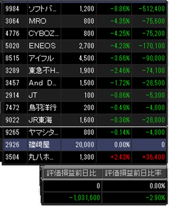 主力の東海旅客鉄道が小幅安にとどまっても大部分の銘柄が派手に下落して、資産全体でも指数より大幅な下げに。1日で100万円を超える下落はあまり見ないですが、想定の範囲内でした。これくらい下げてるかな、と思って口座を開きました。