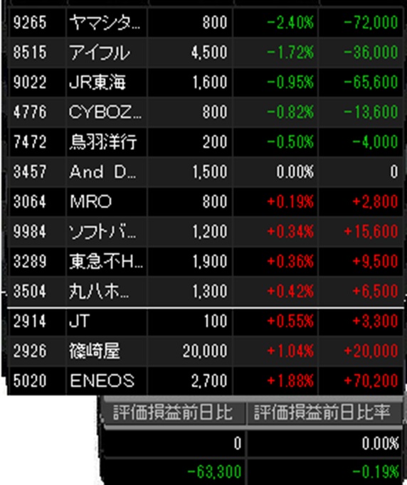 一応過半数の保有銘柄が上昇したもののアイフルがまた悪く、主力の東海旅客鉄道も大きめに下落するなど、資産全体としてはTOPIX弱くらいの下落率に。今日はJTの半期配当金とMonotaROの配当金が入金したのでそれを加えるとやや下げ幅を抑えています。