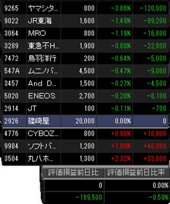 そんな感じで今日、保有銘柄は結構全面安に。丸八HDが反発したところで…ソフトバンクGもちょっと上がりましたが…鳥羽洋行は年初来安値更新ならずタイです。