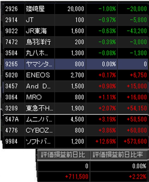 保有銘柄では主力の東海旅客鉄道が逆行安でしたが、サイボウズ、ムニノバHD、東急不HD等も強く、全体でもなかなかの上昇率。今年に入って珍しく、上昇相場に連動しています。まあ、ほぼソフトバンクGによるものですが…