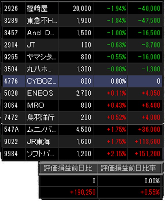 今日は不動産↓。エネオス一旦下げ止まり。ムニノバHD反発。東海旅客鉄道も反発で、月次やや+へ。ソフトバンクGは連続大幅続伸。逆にソフトバンクGがなければ全く相場について行っていない保有資産です。