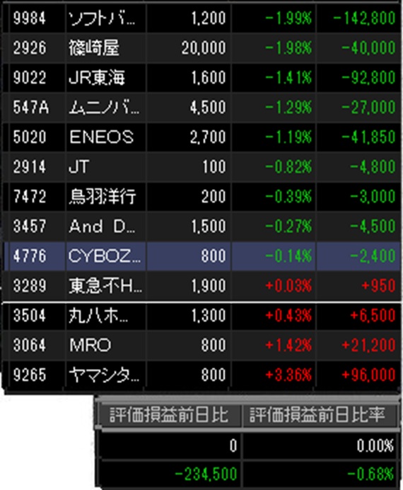 保有銘柄では明日四半期決算発表を控える東海旅客鉄道も安定の下落。無保有のANAは年初来安値と、旅行関連銘柄は明確な逆風。明日の四半期決算の内容にかかわらず、浮上はまだ見込めないようですね。