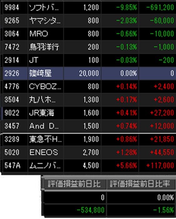 そして主力の東海旅客鉄道は今日本決算発表を控える中、やや反発。前日謎に上がったヤマシタヘルスケアHDは順当に反落。ムニノバHDは5.66%も上昇し上場来高値、ですが前身のアイフルの時を含めると年初来全然マイナスです。エネオスは反発。不動産も↑。全体ではソフトバンクGさえ下げなければ+ではありました。+ではあったが小幅でした。ソフトバンクGはプライム2位の下落率。